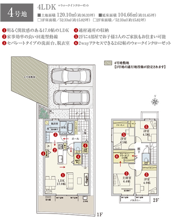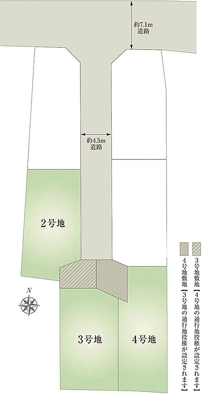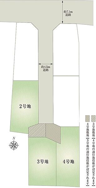 | 建物面積 | 96.48m2(2号地)、97.72m2(3号地)、104.66m2(4号地) | 土地面積 | 122.07m2(2号地)、140.17m2(3号地)、141.43m2(4号地) 私道負担なし |