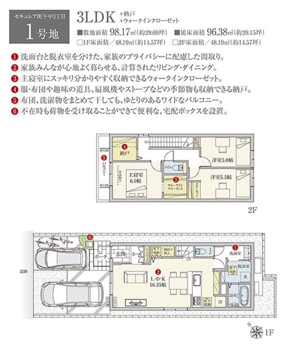 | 建物面積 | 96.38m2(1号地)、96.38m2(2号地) | 土地面積 | 98.17m2(1号地)、98.06m2(2号地) 全て私道負担なし |