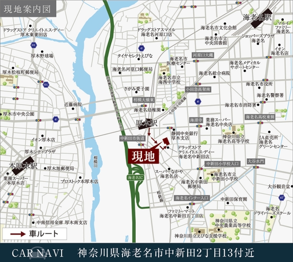 小田急小田原線「厚木」駅 徒歩6分 小田急小田原線「海老名」駅 徒歩25分 JR相模線「海老名」駅 徒歩25分 |