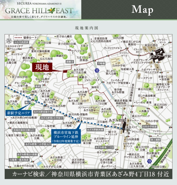 東急田園都市線「たまプラーザ」駅 徒歩18分~19分 東急田園都市線「あざみ野」駅 徒歩18分~19分 横浜市営地下鉄ブルーライン「あざみ野」駅 徒歩18分~19分 |