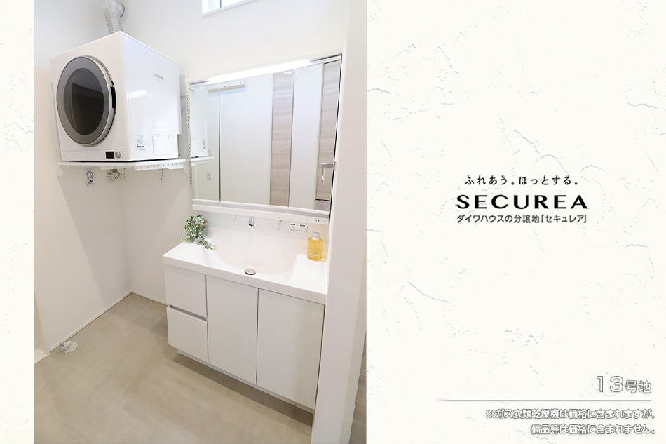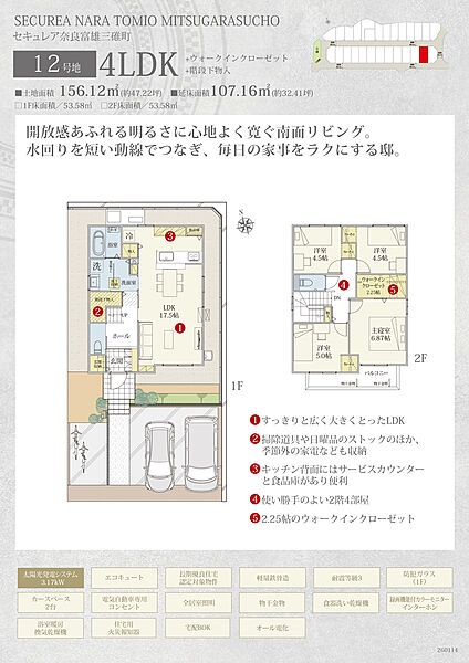 | 建物面積 | 107.16m2(12号地)、113.28m2(13号地) | 土地面積 | 156.12m2(12号地)、146.64m2(13号地) 全て私道負担なし |