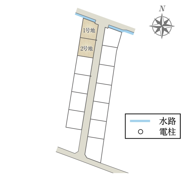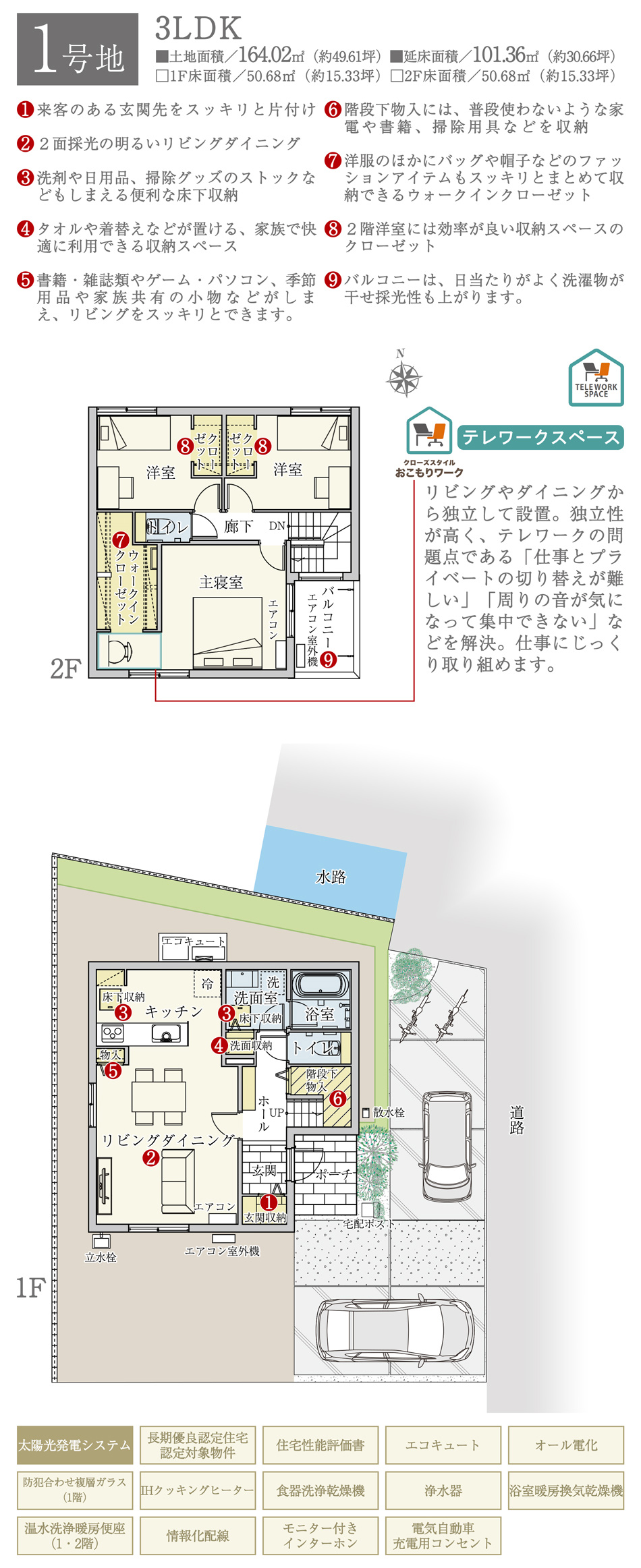 | 建物面積 | 101.36m2(1号地)、103.01m2(2号地) | 土地面積 | 164.02m2(1号地)、166.14m2(2号地) 全て私道負担なし |