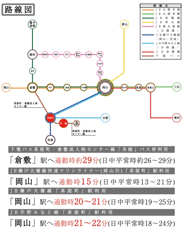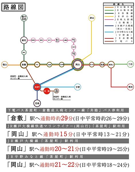 JR宇野線「茶屋町」駅 徒歩12分~12分 JR瀬戸大橋線「茶屋町」駅 徒歩12分~12分 |