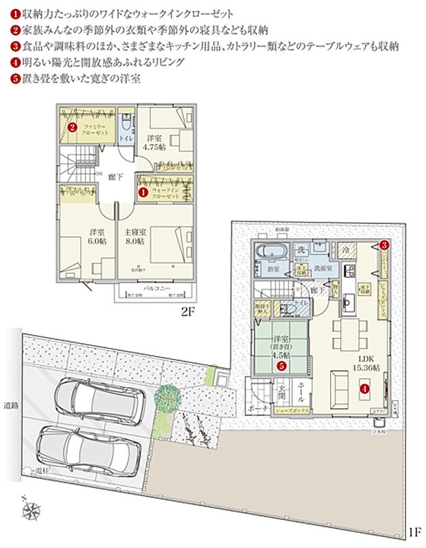 | 駐車場 | 2台 | 道路の幅員 | 5.6m~5.7m(アスファルト舗装) |