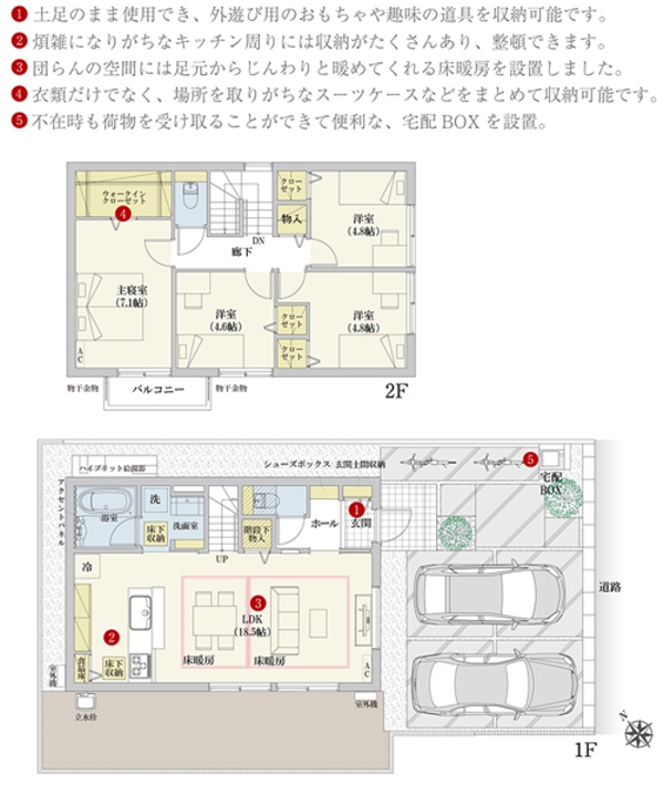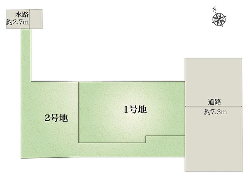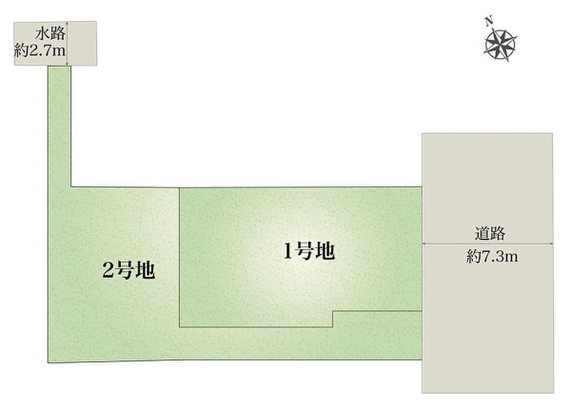 | 建物面積 | 99.53m2(1号地)、103.01m2(2号地) | 土地面積 | 122.78m2(1号地)、131.47m2(2号地) 全て私道負担なし |