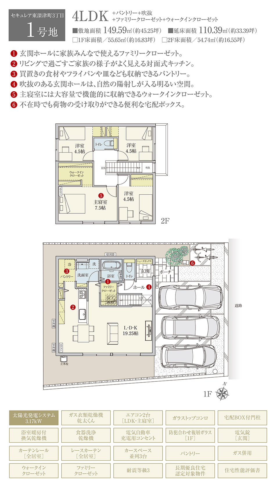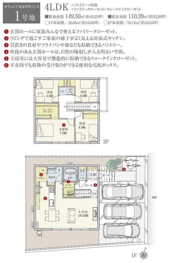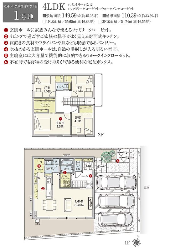 | 建物面積 | 110.39m2(1号地)、111.30m2(2号地) | 土地面積 | 149.59m2(1号地)、149.71m2(2号地) 全て私道負担なし |