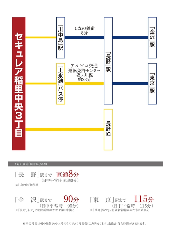 JR篠ノ井線「川中島」駅 徒歩30分~30分 JR北陸新幹線「長野」駅 徒歩68分~69分 |