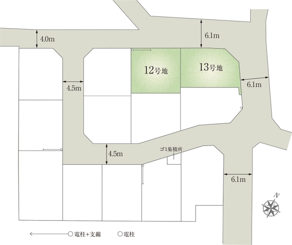 | 間取り | 4LDK(12号地、13号地) | 建物構造 | 軽量鉄骨2階建(2戸) |