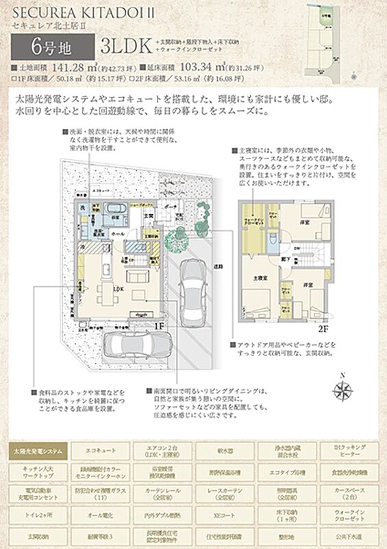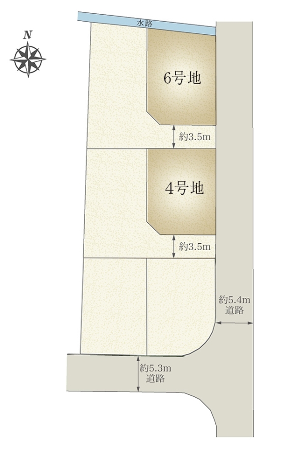 | 建物面積 | 109.64m2(4号地)、103.34m2(6号地) | 土地面積 | 137.63m2(4号地)、141.28m2(6号地) 全て私道負担なし |