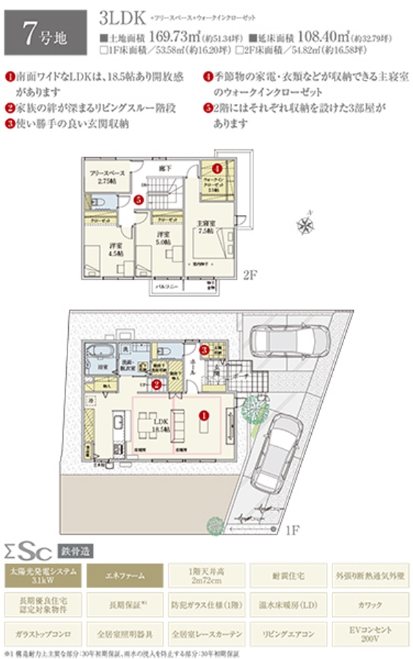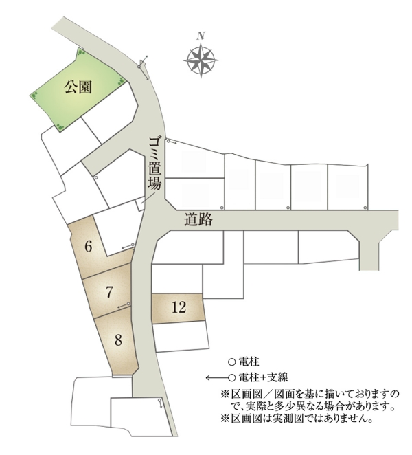 | 建物面積 | 104.66m2(6号地)、108.40m2(7号地)、103.76m2(8号地)、97.70m2(12号地) | 土地面積 | 181.17m2(6号地)、169.73m2(7号地)、179.82m2(8号地)、135.82m2(12号地) 私道負担なし |