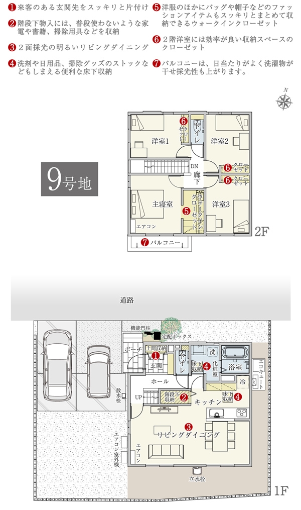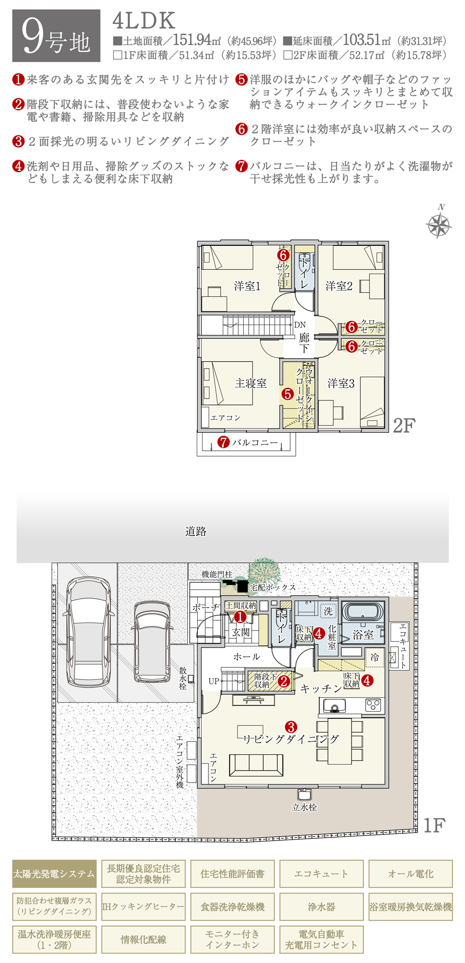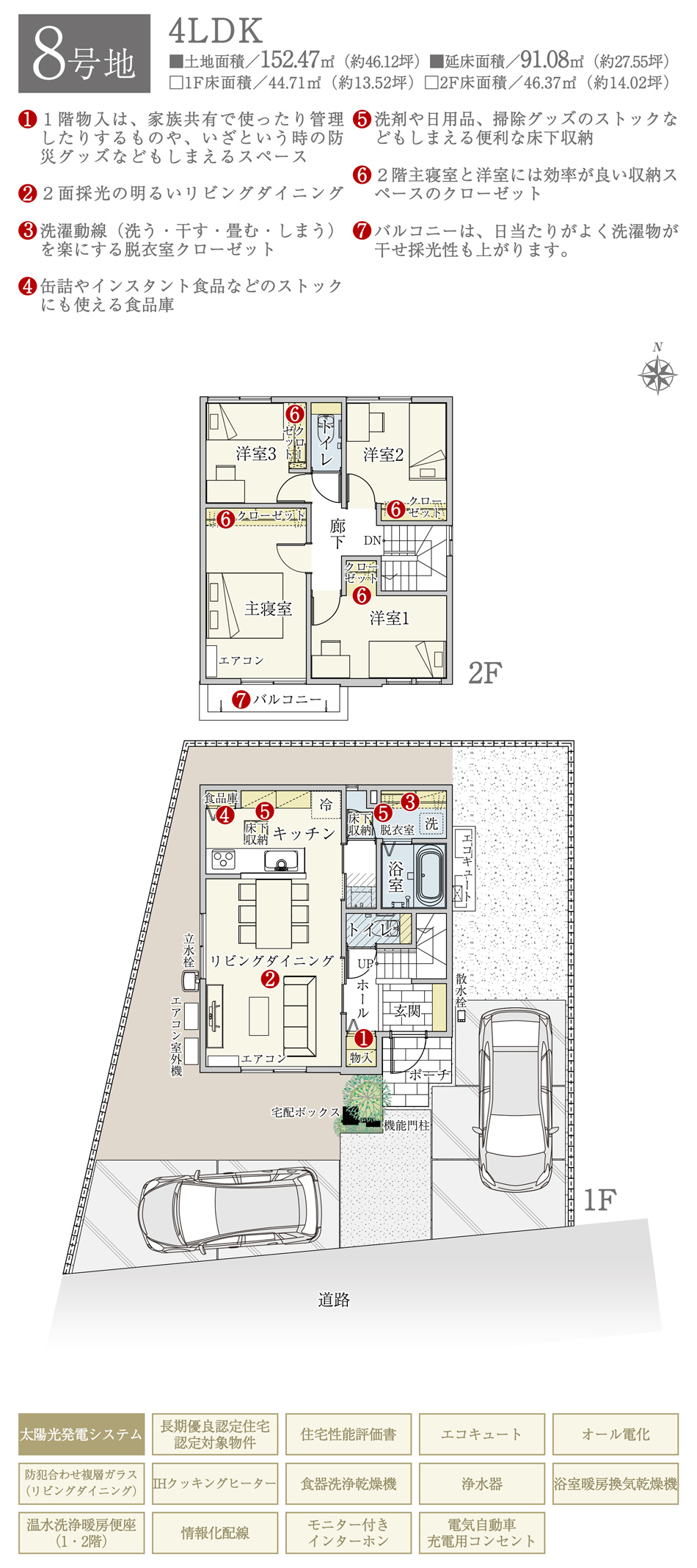 | 建物面積 | 91.08m2(8号地)、103.51m2(9号地)、91.08m2(10号地) | 土地面積 | 152.47m2(8号地)、151.94m2(9号地)、151.90m2(10号地) 私道負担なし |