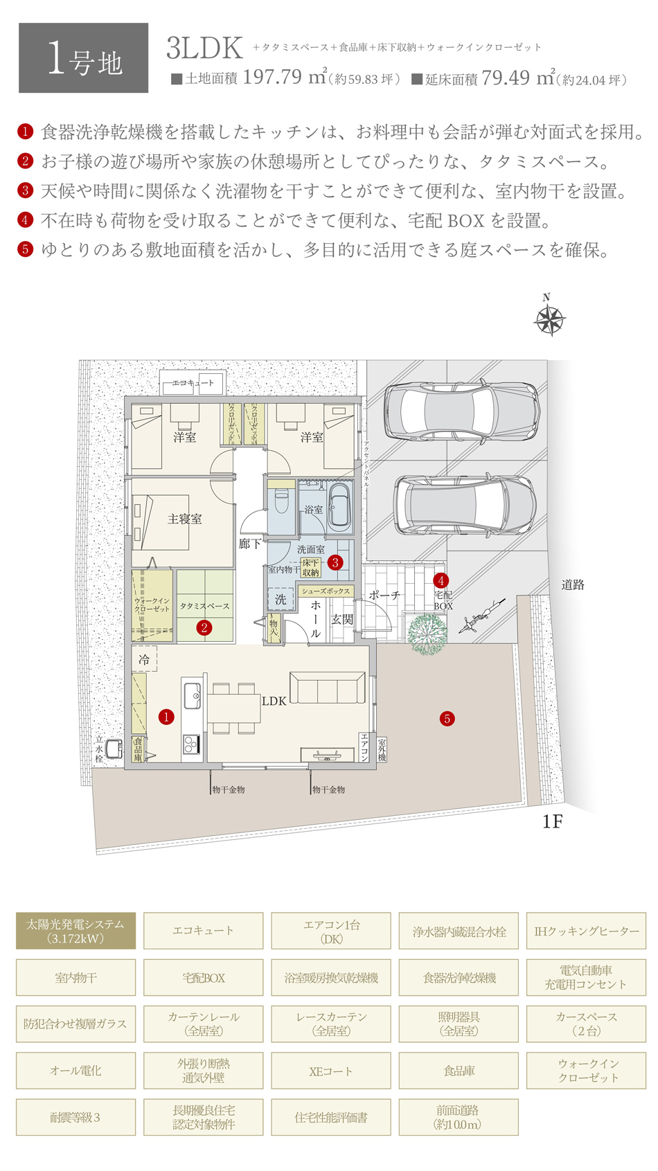 | 建物面積 | 79.49m2(1号地) | 土地面積 | 197.79m2(1号地) 私道負担なし |