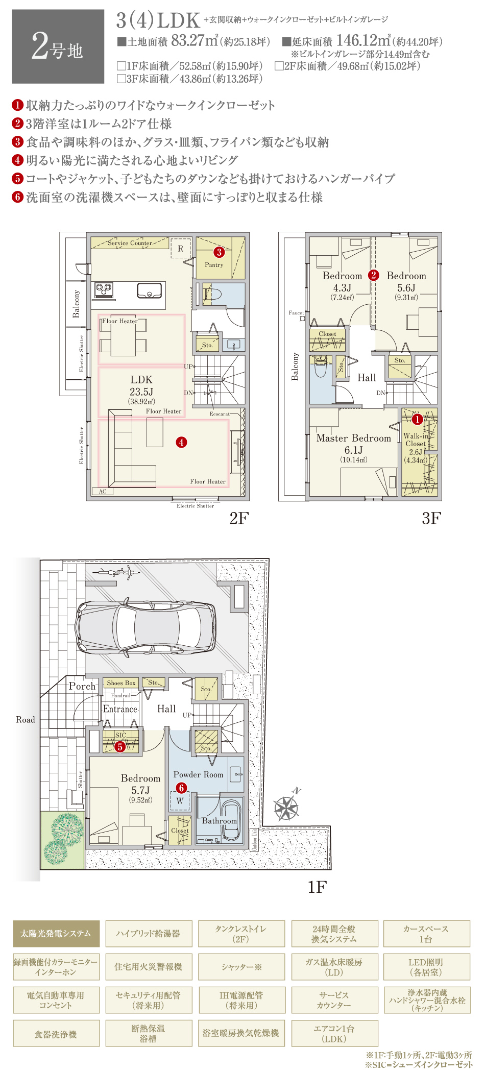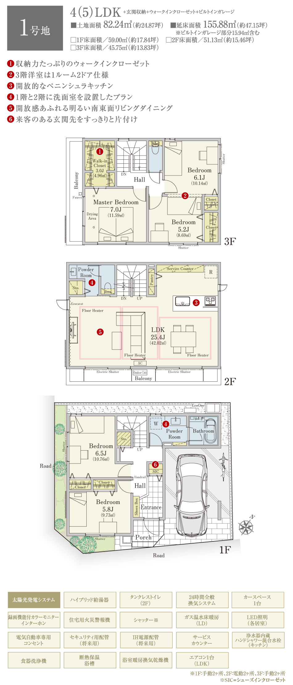 | 建物面積 | 155.88m2(1号地)、146.12m2(2号地) | 土地面積 | 82.24m2(1号地)、83.27m2(2号地) 全て私道負担なし |