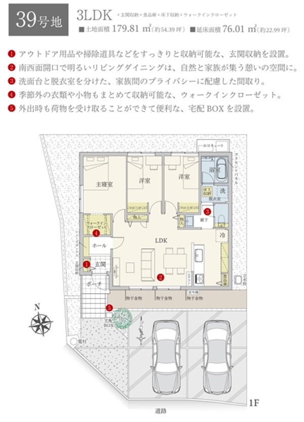 | 建物面積 | 76.01m2(39号地) | 土地面積 | 179.81m2(39号地) 私道負担なし |