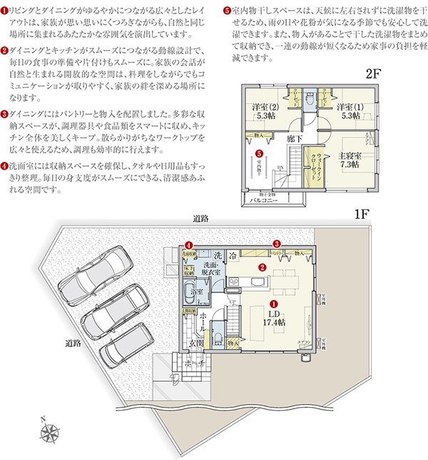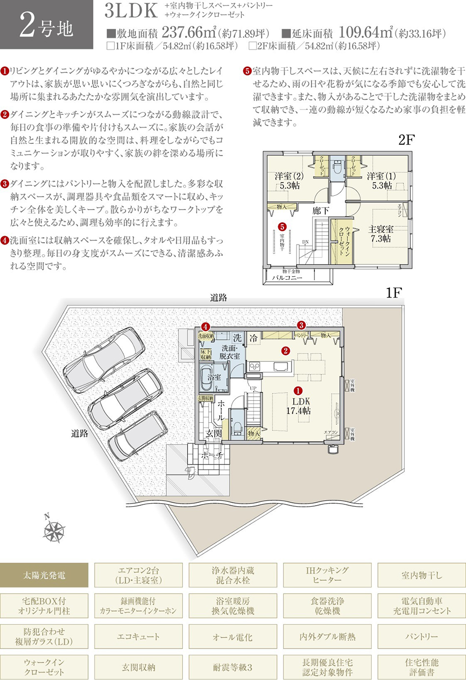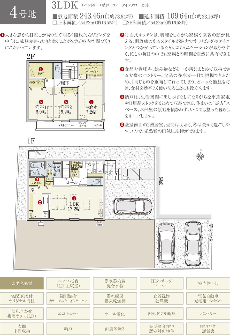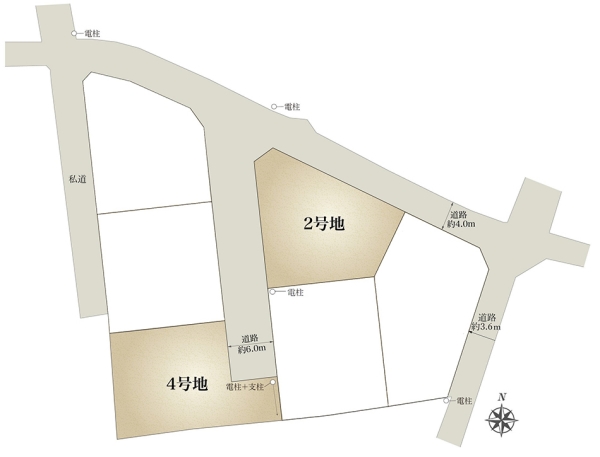 | 建物面積 | 109.64m2(2号地)、109.64m2(4号地) | 土地面積 | 237.66m2(2号地)、243.46m2(4号地) 全て私道負担なし |