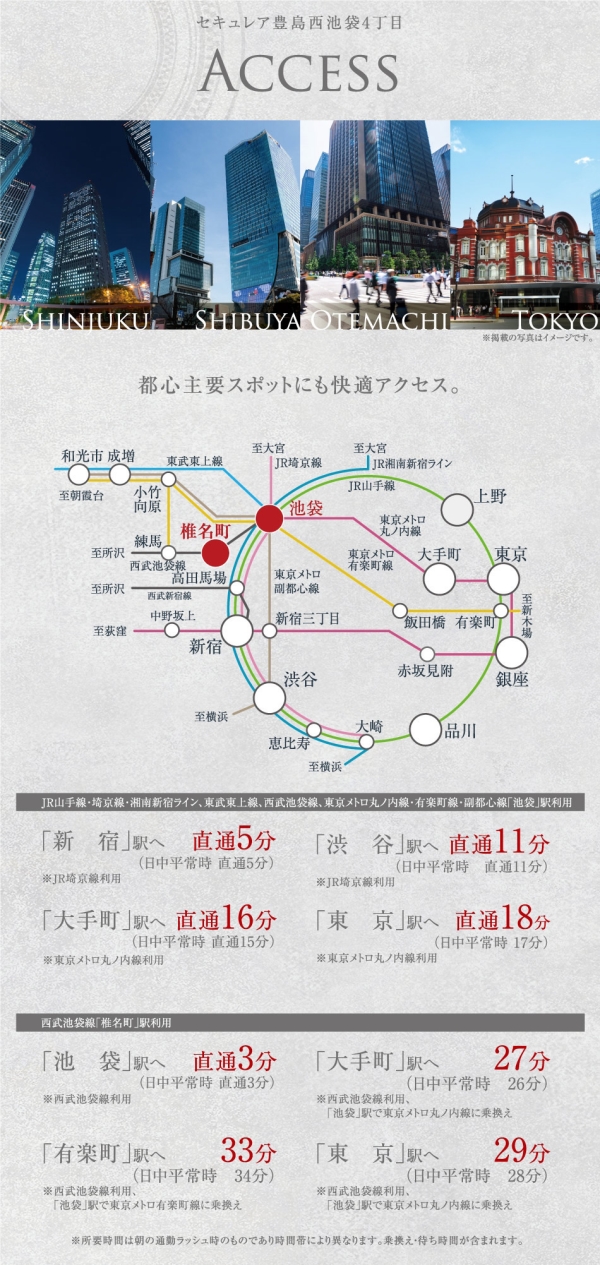 西武池袋線「椎名町」駅 徒歩5分 西武池袋線「池袋」駅 徒歩14分 JR山手線「目白」駅 徒歩16分 |