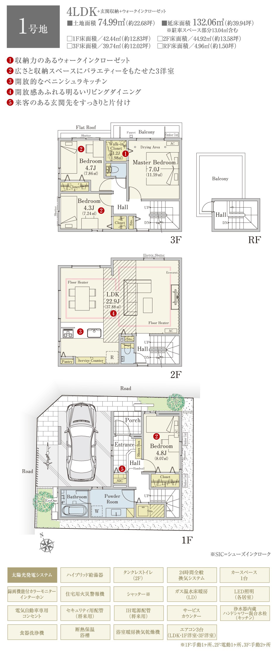 | 建物面積 | 132.06m2(1号地) | 土地面積 | 74.99m2 私道負担あり 8.19m2(1号地) |