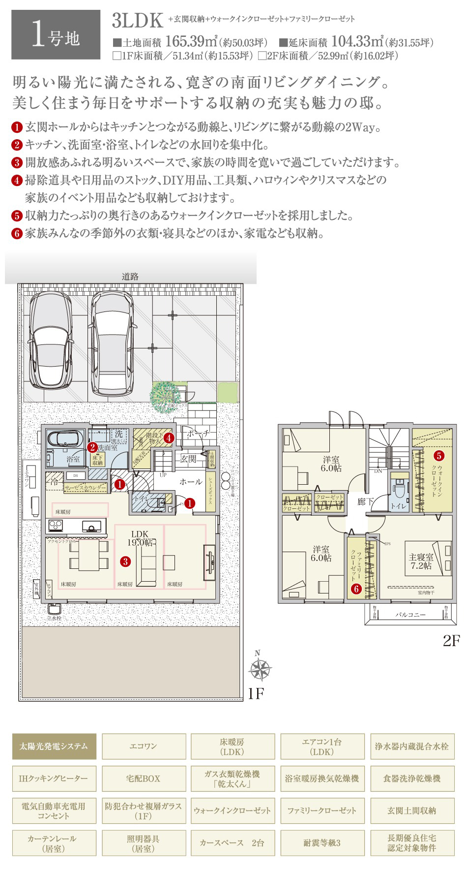 | 建物面積 | 104.33m2(1号地)、97.70m2(2号地) | 土地面積 | 165.39m2(1号地)、152.39m2(2号地) 全て私道負担なし |