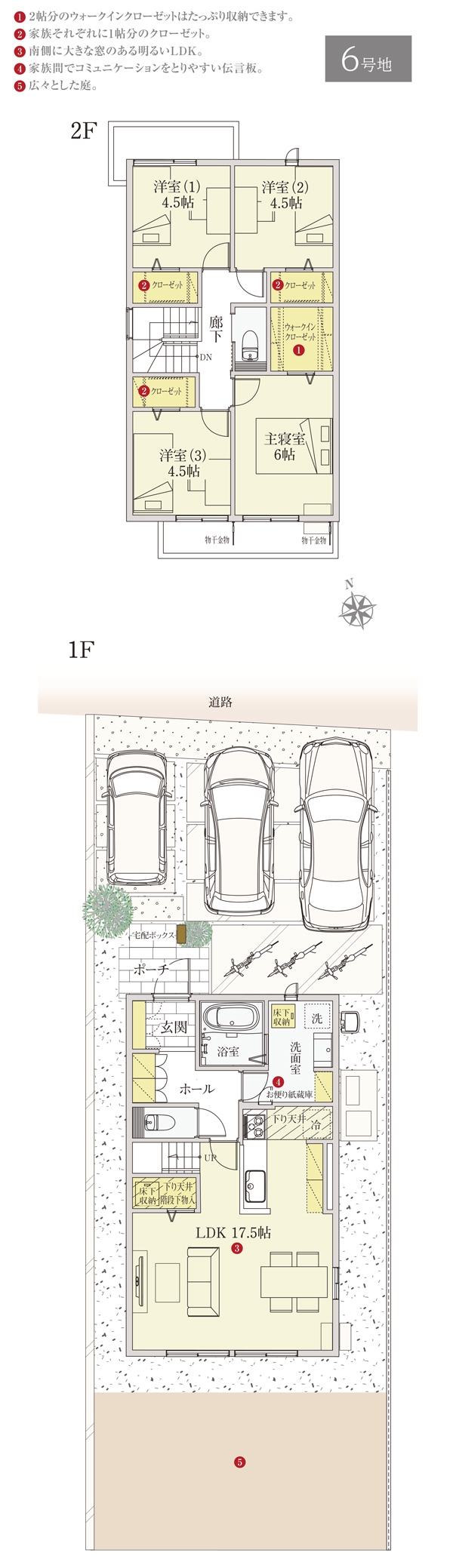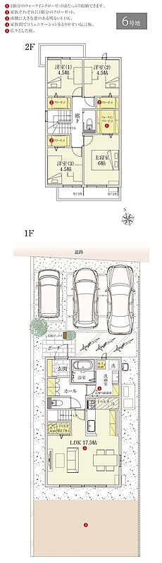 | 建物面積 | 103.84m2(5号地)、104.66m2(6号地) | 土地面積 | 170.17m2(5号地)、173.48m2(6号地) 全て私道負担なし |