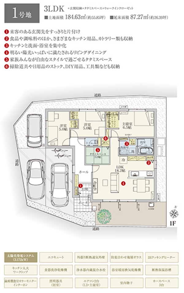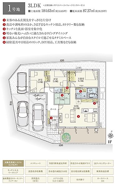 | 建物面積 | 87.27m2(1号地) | 土地面積 | 184.63m2(1号地) 私道負担なし |