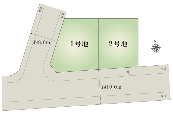 | 建物面積 | 101.86m2(1号地)、106.00m2(2号地) | 土地面積 | 187.09m2(1号地)、167.37m2(2号地) 全て私道負担なし |