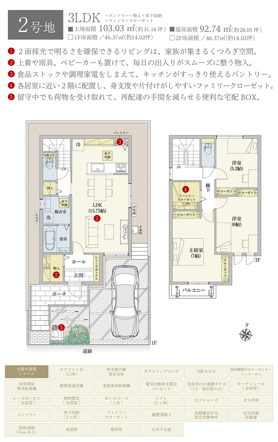 | 建物面積 | 92.74m2(1号地)、92.74m2(2号地)、92.74m2(3号地) | 土地面積 | 103.06m2(1号地)、103.03m2(2号地)、103.05m2(3号地) 私道負担なし |
