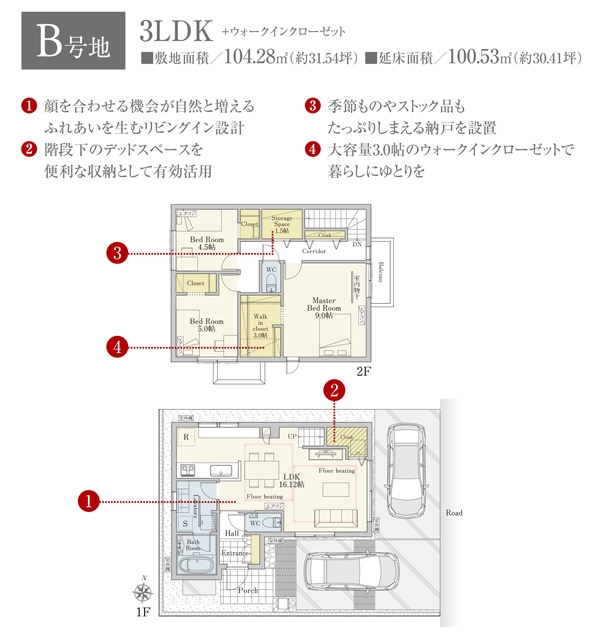 | 建物面積 | 102.02m2(A号地)、100.53m2(B号地) | 土地面積 | 108.03m2(A号地)、104.28m2(B号地) 全て私道負担なし |