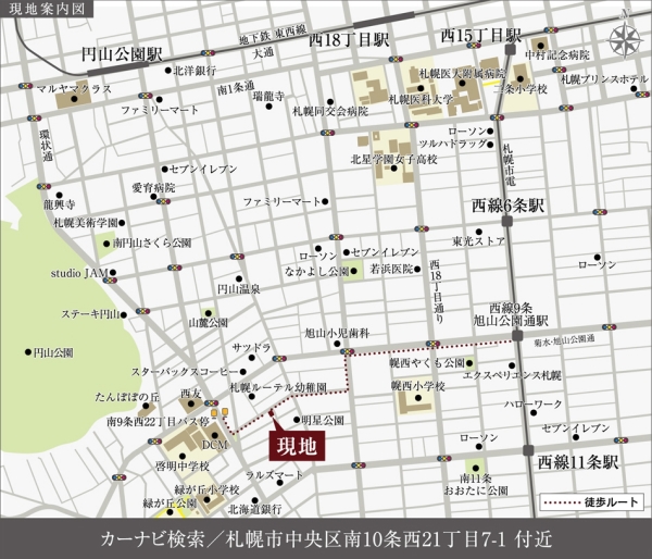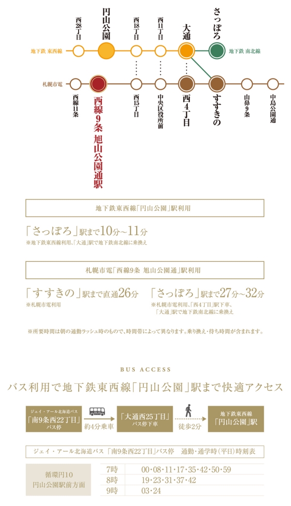 札幌市電2系統「西線9条旭山公園通」駅 徒歩12分 札幌市営東西線「円山公園」駅 徒歩19分 札幌市営東西線「円山公園」駅 徒歩19分 |