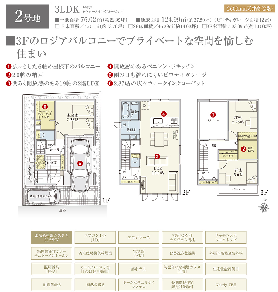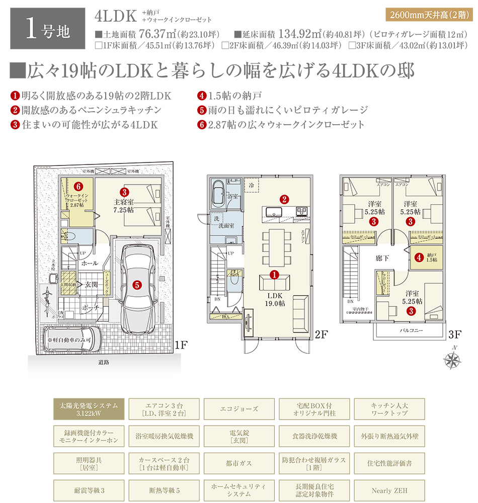 | 建物面積 | 134.92m2(1号地)、124.99m2(2号地) | 土地面積 | 76.37m2(1号地)、76.02m2(2号地) 全て私道負担なし |