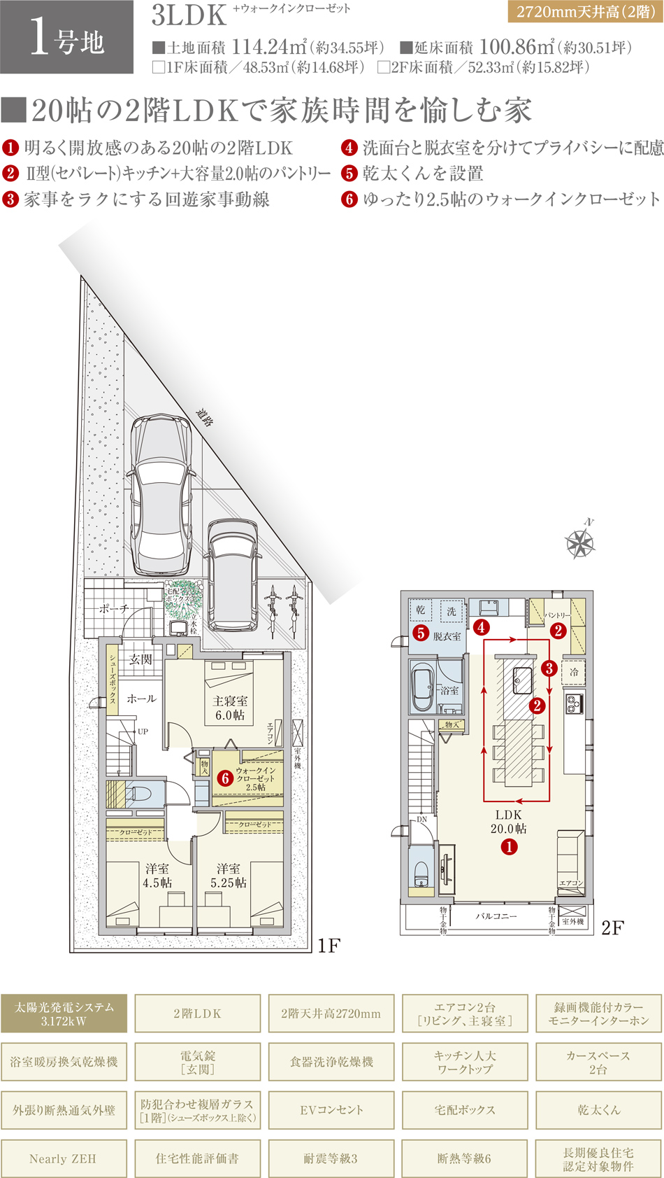 | 建物面積 | 100.86m2(1号地) | 土地面積 | 114.24m2(1号地) 私道負担なし |