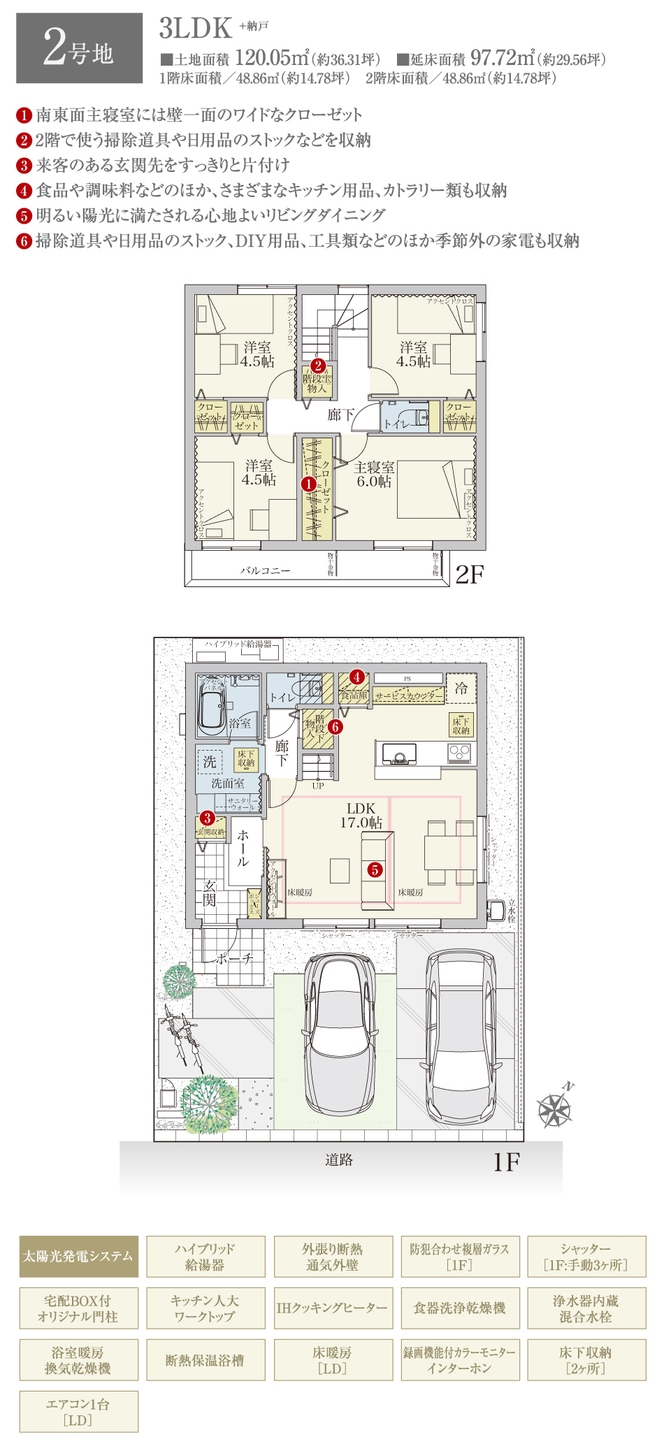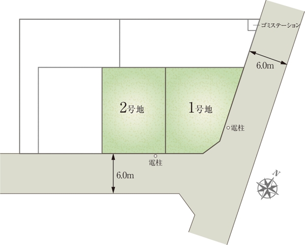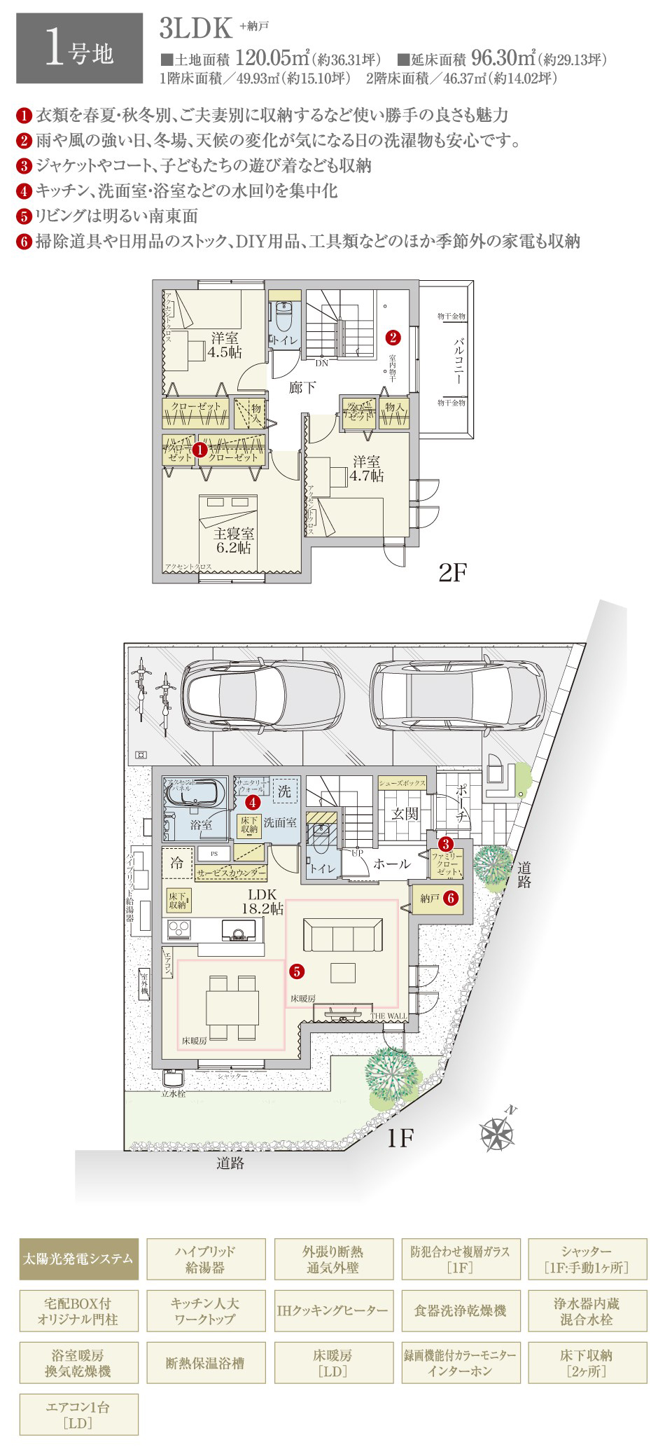 | 建物面積 | 96.30m2(1号地)、97.72m2(2号地) | 土地面積 | 120.05m2(1号地)、120.05m2(2号地) 全て私道負担なし |