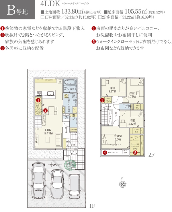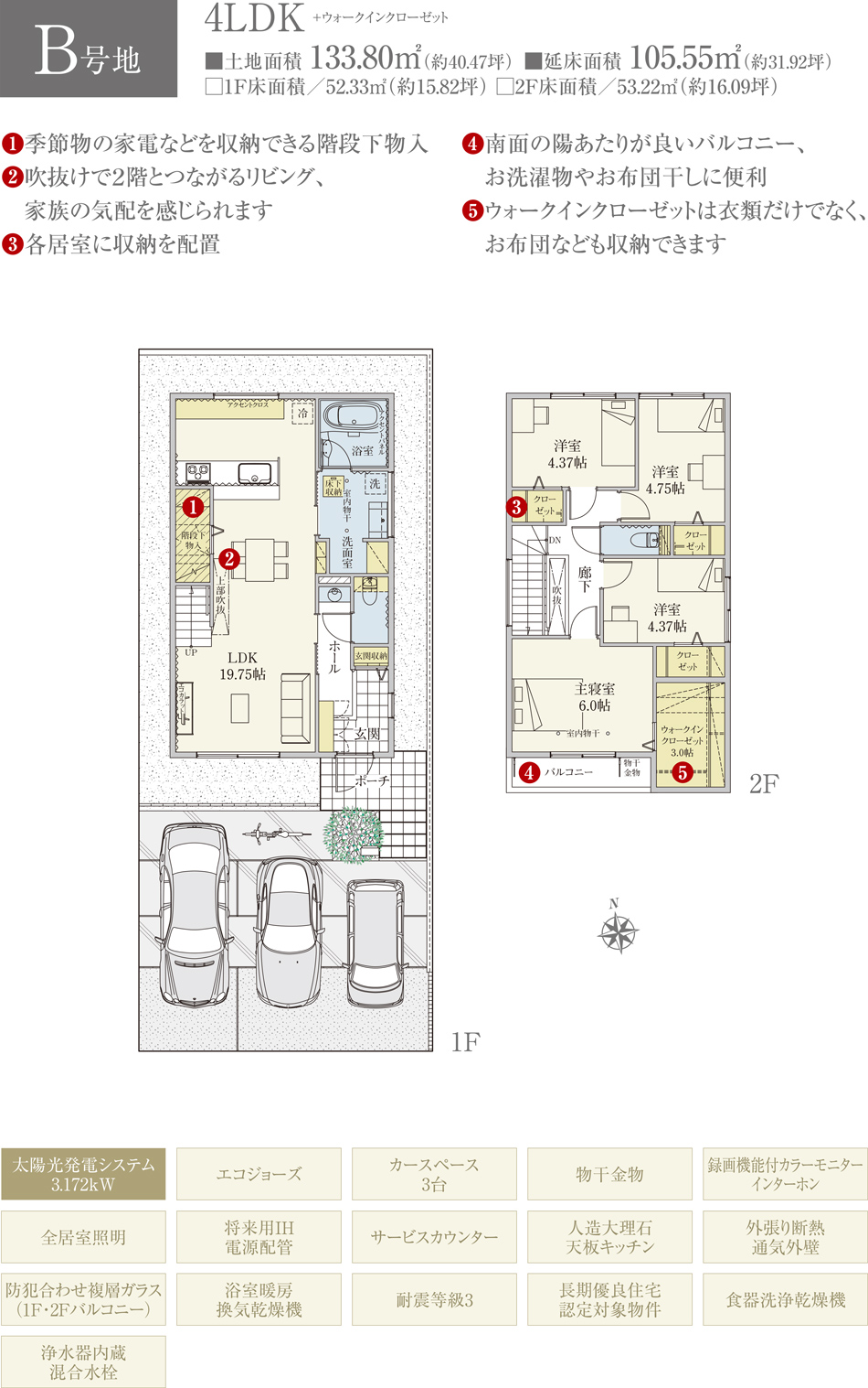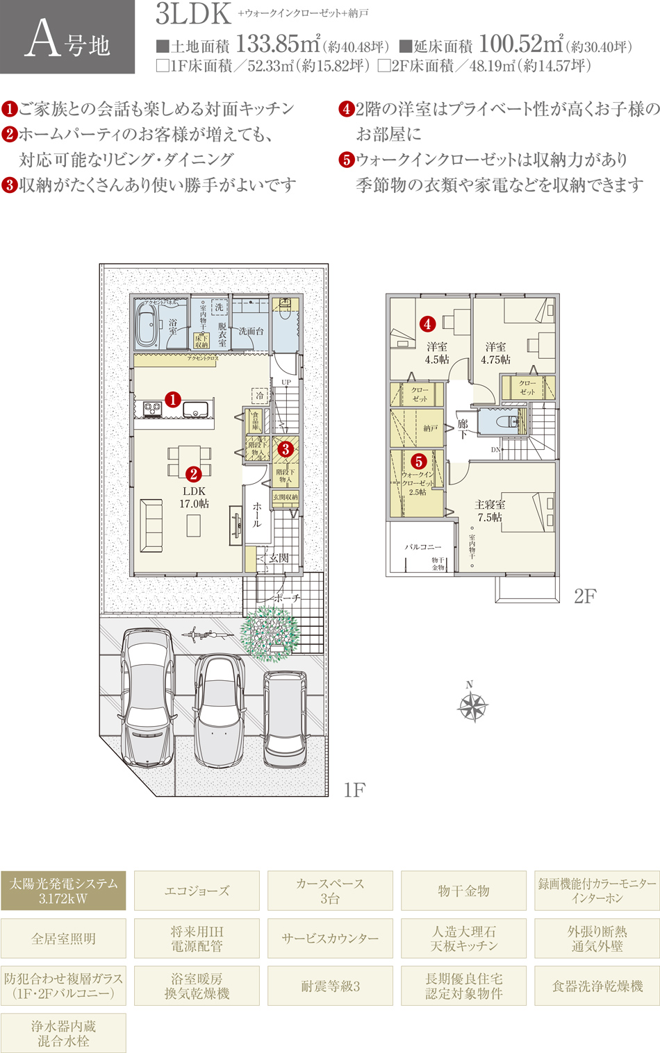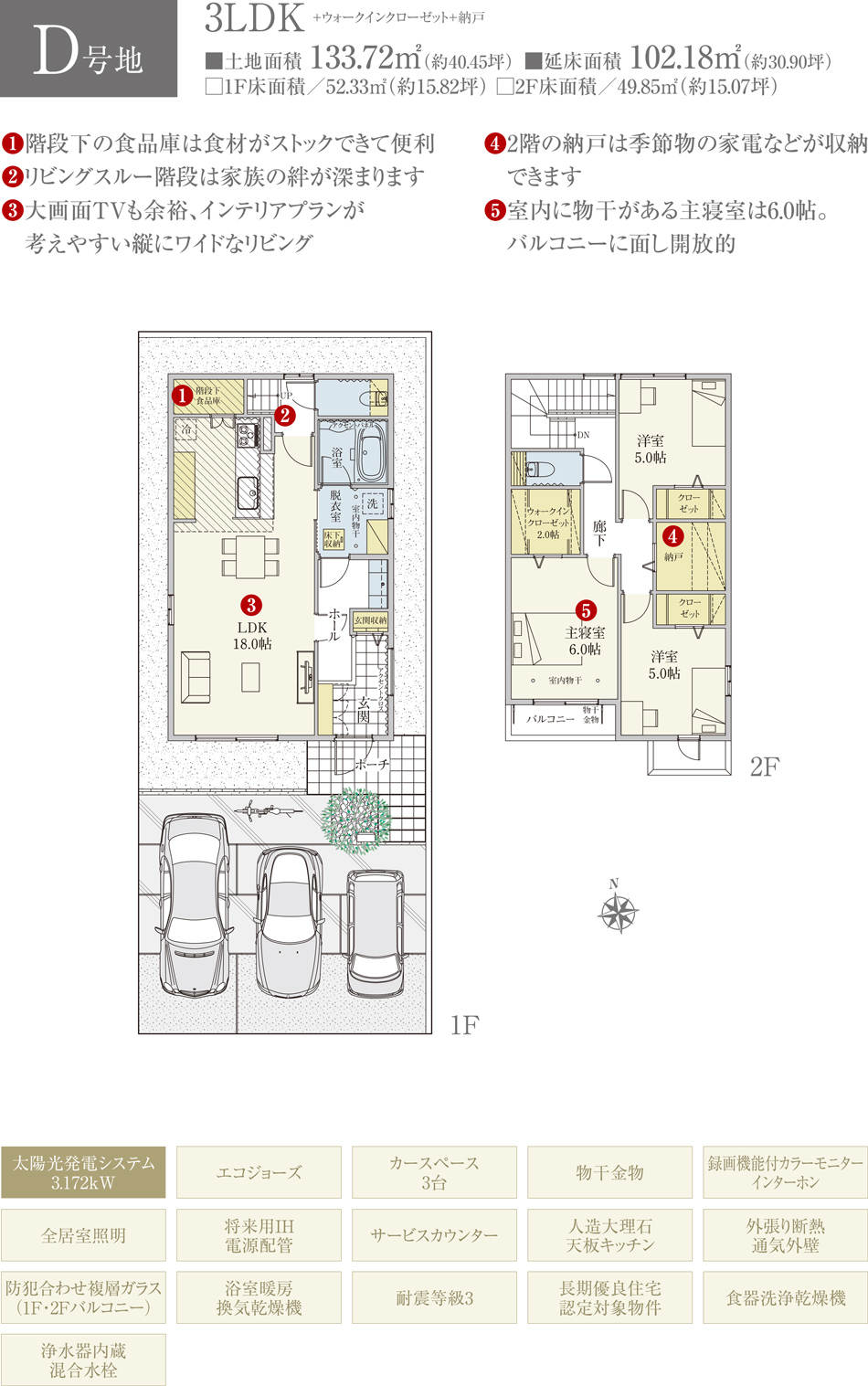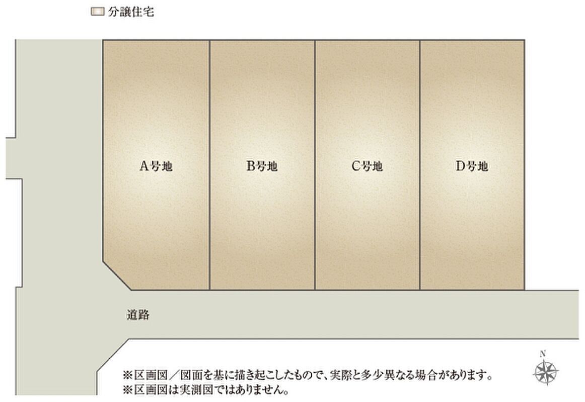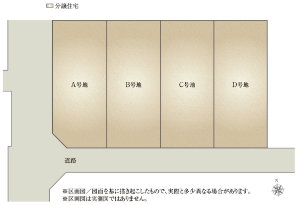 | 建物面積 | 100.52m2(A号地)、105.55m2(B号地)、104.66m2(C号地)、102.18m2(D号地) | 土地面積 | 133.85m2(A号地)、133.80m2(B号地)、133.85m2(C号地)、133.72m2(D号地) 全て私道負担なし |