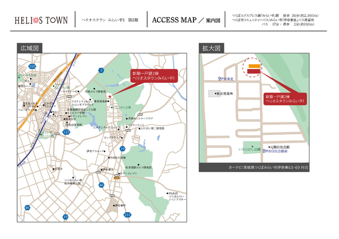つくばエクスプレス「みらい平」駅 徒歩37分 つくばエクスプレス「みらい平」駅 コミュニティーバスみらい号17分 「伊那東」バス停徒歩3分 徒歩20分 |