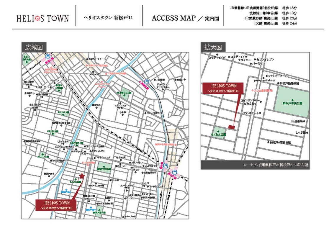 JR常磐線「新松戸」駅 徒歩17分~18分 JR武蔵野線「新松戸」駅 徒歩17分~18分 つくばエクスプレス「南流山」駅 徒歩22分~23分 |