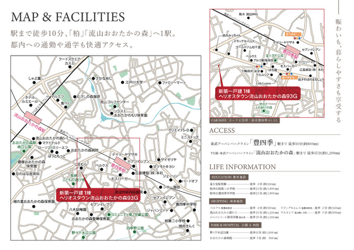 東武野田線「豊四季」駅 徒歩10分 つくばエクスプレス「流山おおたかの森」駅 徒歩15分 つくばエクスプレス「流山セントラルパーク」駅 徒歩31分 |