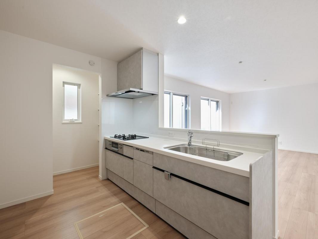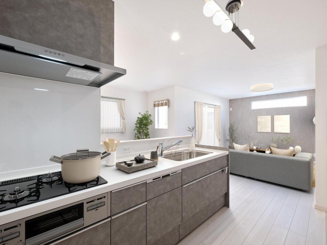キッチンからはリビングダイニングが見渡せ、お子さんを見守りながら家事ができる空間設計です。