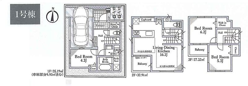 | 建物面積 | 1号棟 95.42m2(駐車場面積9.93m2含む) | 土地面積 | 1号棟 60.38m2 |