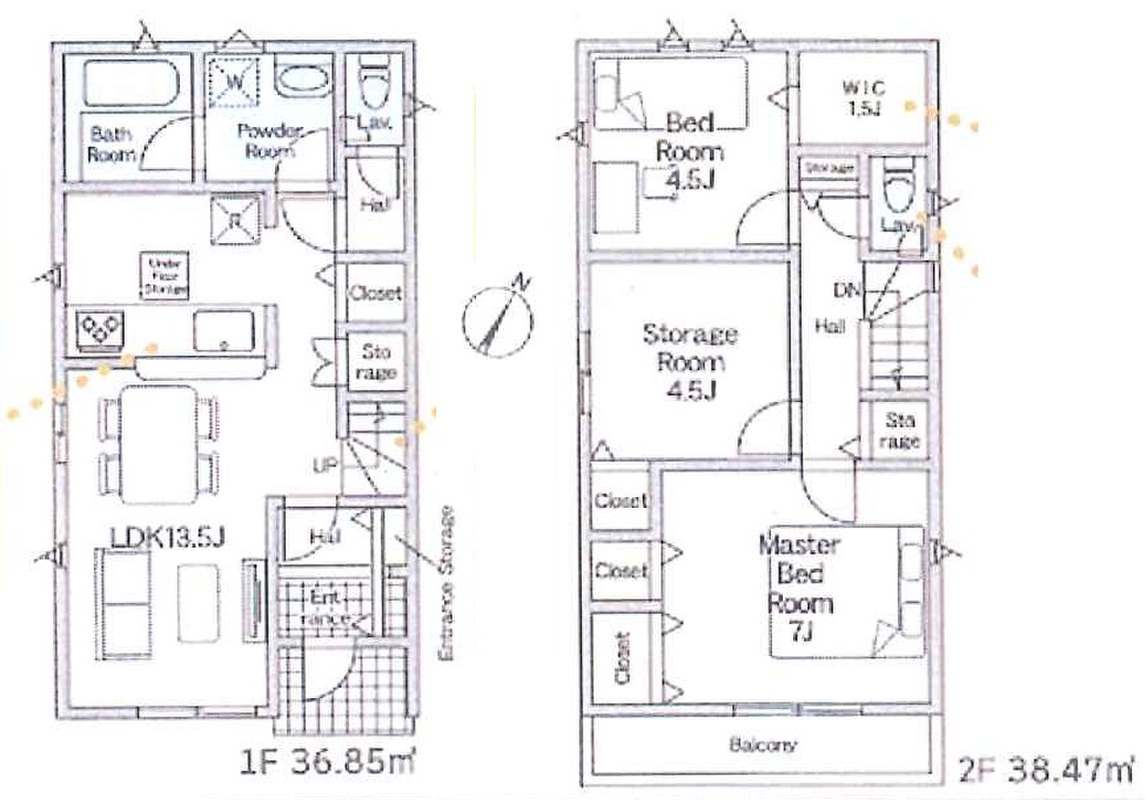 | 建物面積 | 1号棟・74.51m2、2号棟・75.32m2 | 土地面積 | 1号棟・93.59m2、2号棟・94.17m2 |