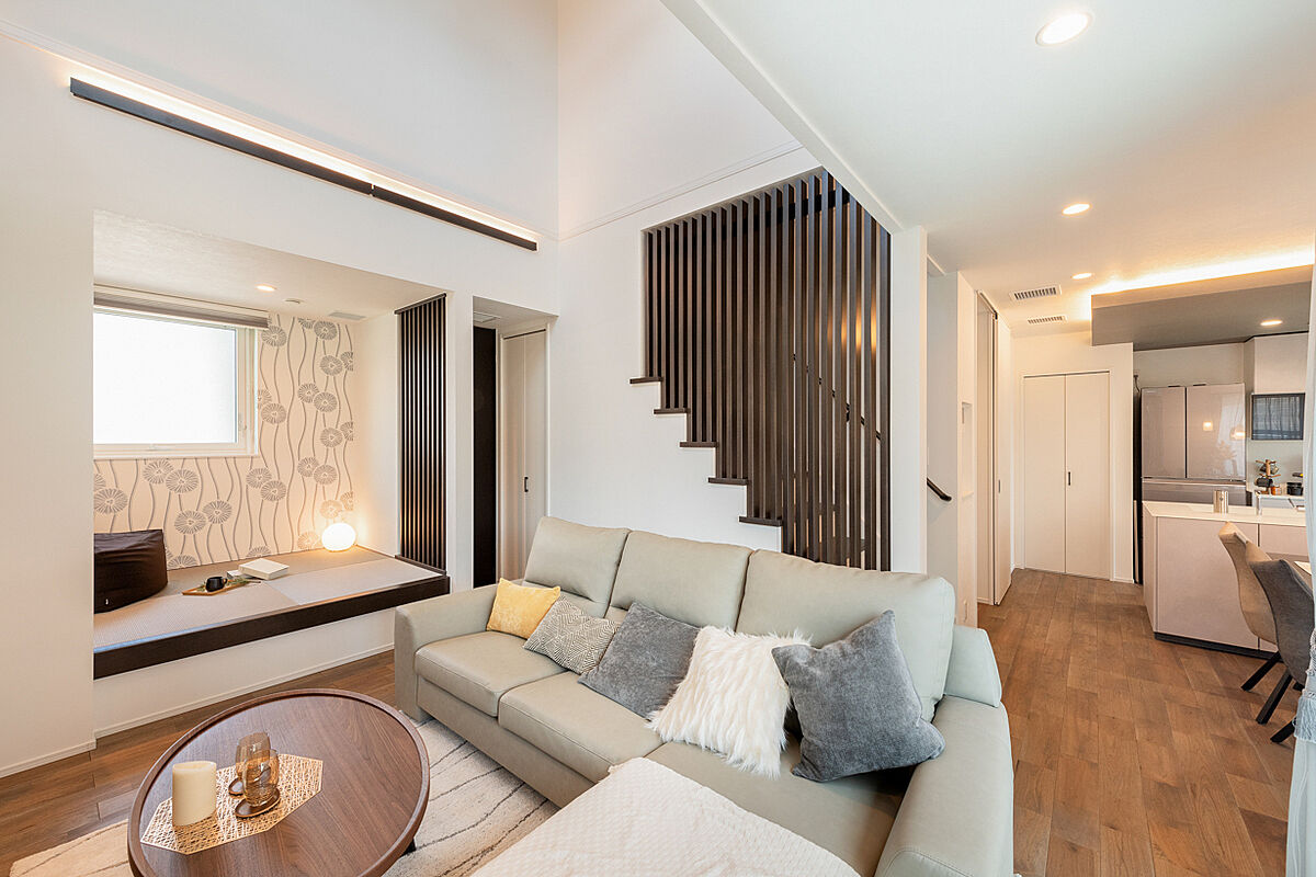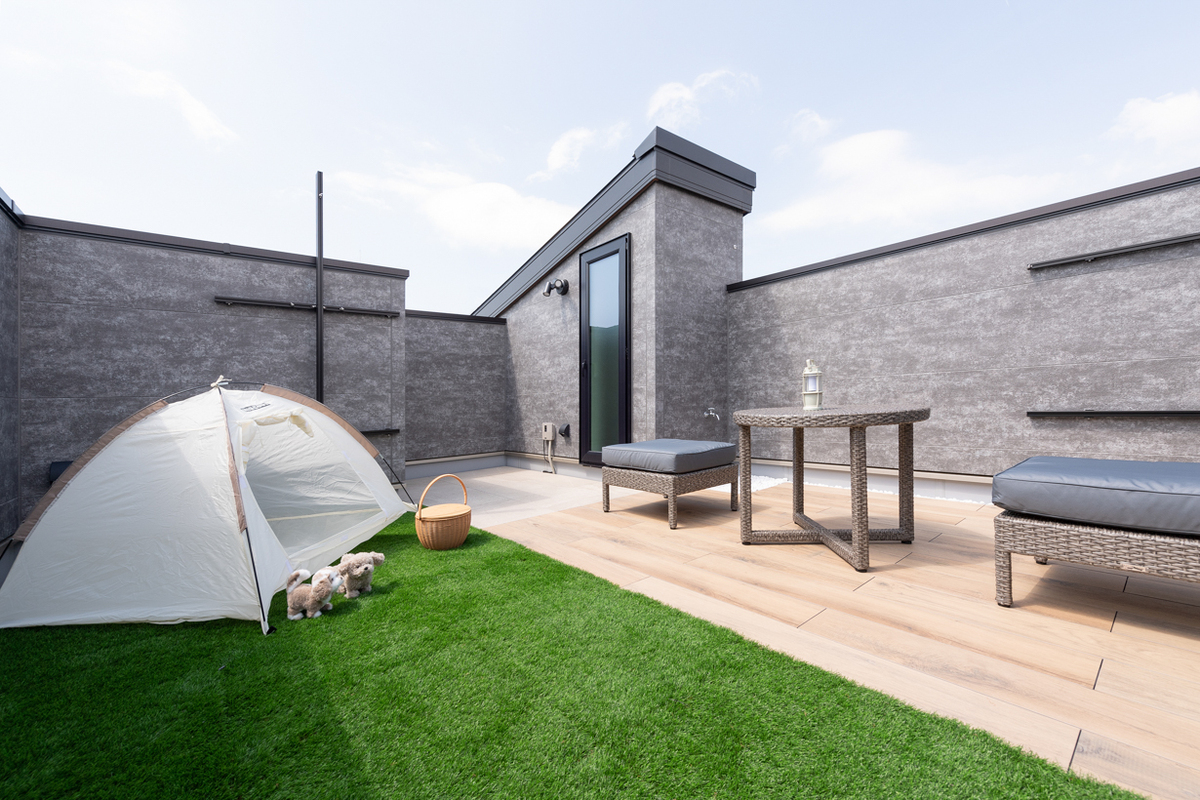 吹き抜けとリビング階段で明るいリビング、回遊動線で家事がスムーズになる住まい。 屋上庭園やウッドデッキではキャンプやヨガなど、家族みんなで楽しいソト時間が過ごせそうです。 全館空調だから光あふれる大空間でも家中快適な温度で過ごせます。 |