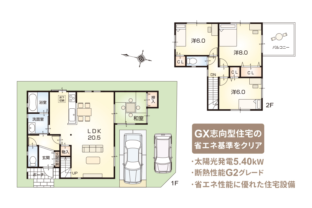 ■太陽光発電5.40kW搭載の【ZEH仕様】が全戸標準!さらに【HEAT20・G2グレード仕様】付!先進仕様充実の、快適で高性能な住まいを実現します。