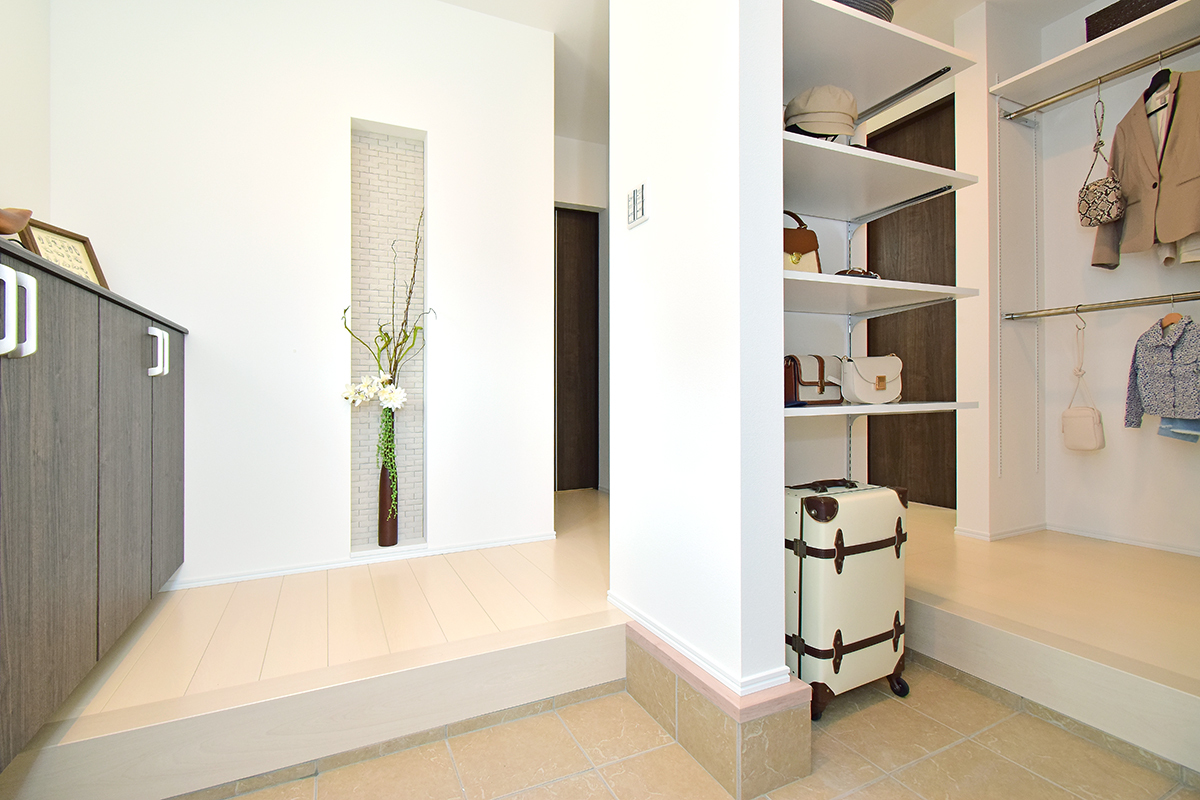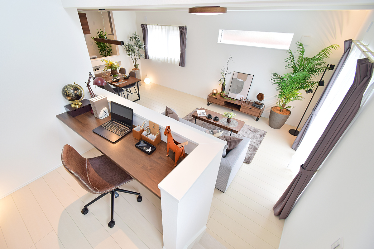 ■【モデルハウス最終分譲!】2階へ上がる階段途中に吹抜スタディスペースを設けた、広がりある住まいです。動線を分けられる、玄関の収納スペースもポイント!