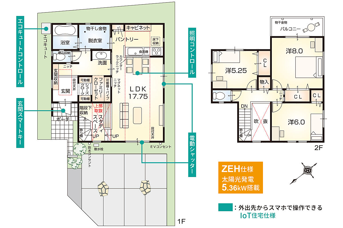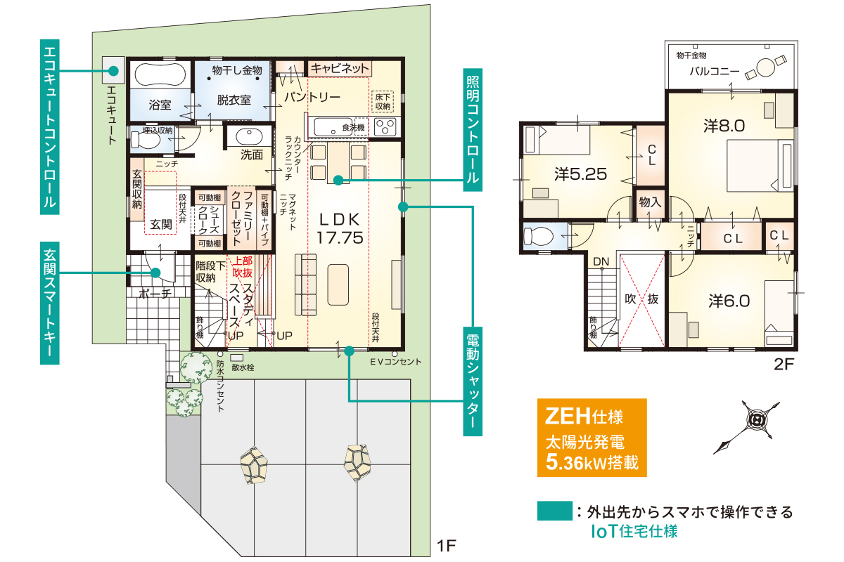 ■【ZEH&Iotの先進住宅】太陽光発電 5.36kW搭載の「ZEH仕様」と、家の設備家電をスマホ等で遠隔操作できる「IoT住宅仕様」を採用!先進で快適便利な住まいです。