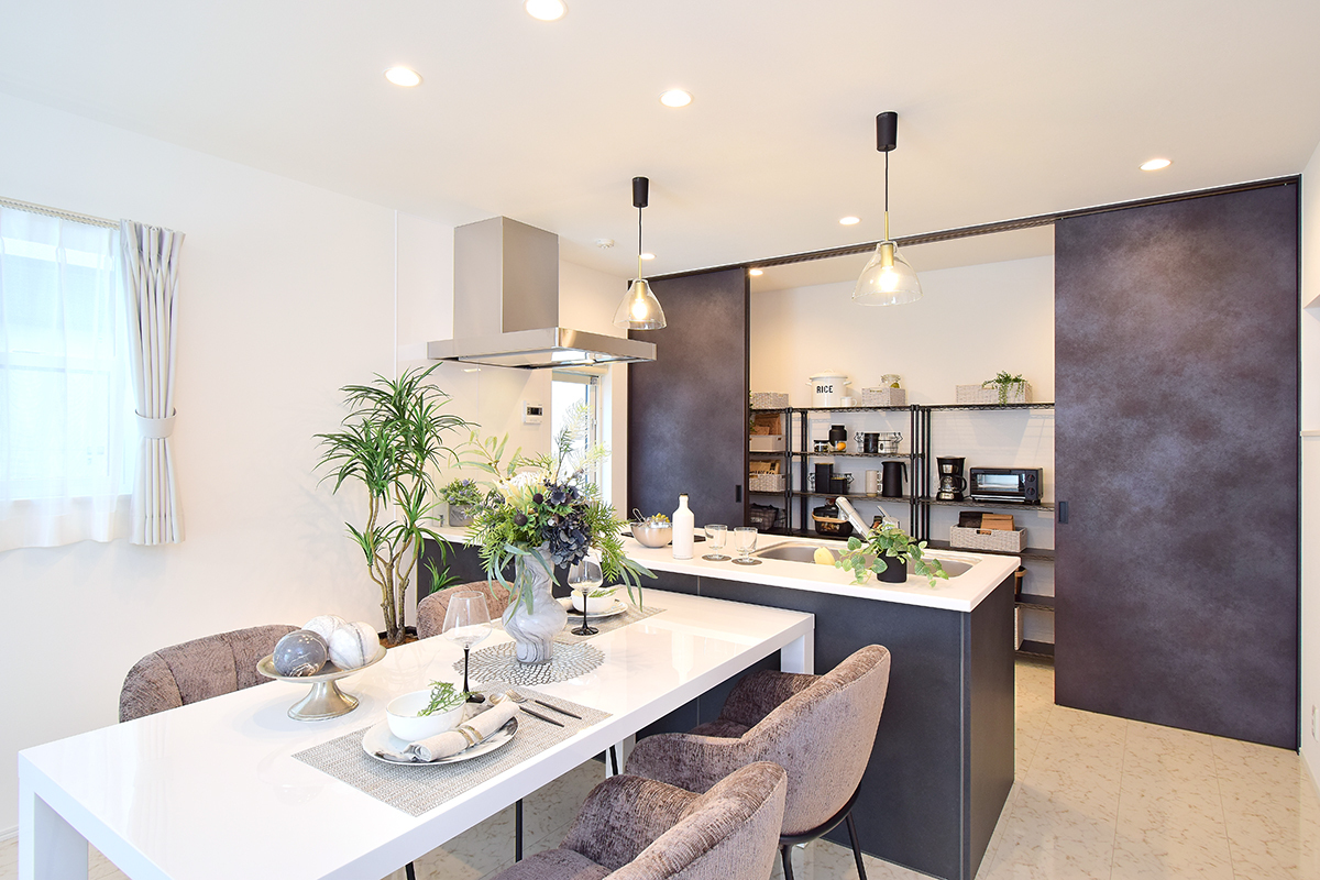 ■【先進モデルハウス4号地完成!】キッチン背面に、生活感を隠せる扉付きの収納を設置!明るくすっきりとした20帖LDKの住まいです。専任設計士とつくる、自由設計の区画もあります。
