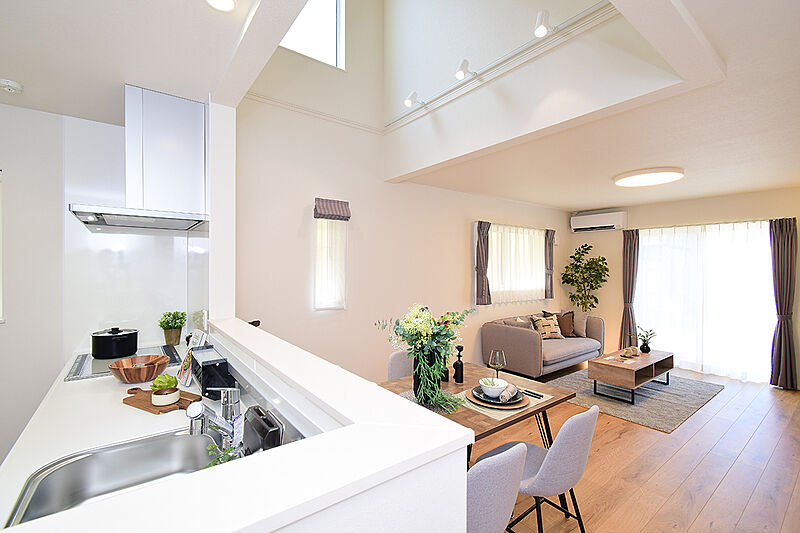 ■【先進モデルハウス完成!】LDKの真ん中に大きな吹抜のある住まい!1階ホールとキッチンをつなぐファミリークローゼットも見どころです。
