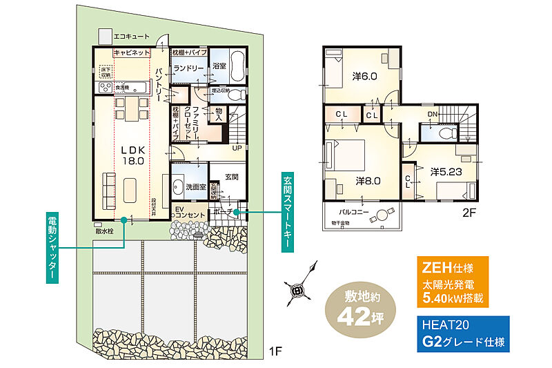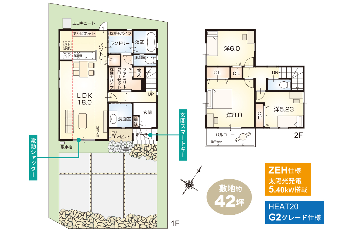 ■太陽光発電5.40kW搭載の【ZEH仕様】が全戸標準!さらに【HEAT20・G2グレード仕様】付!先進仕様充実の、快適で高性能な住まいを実現します。
