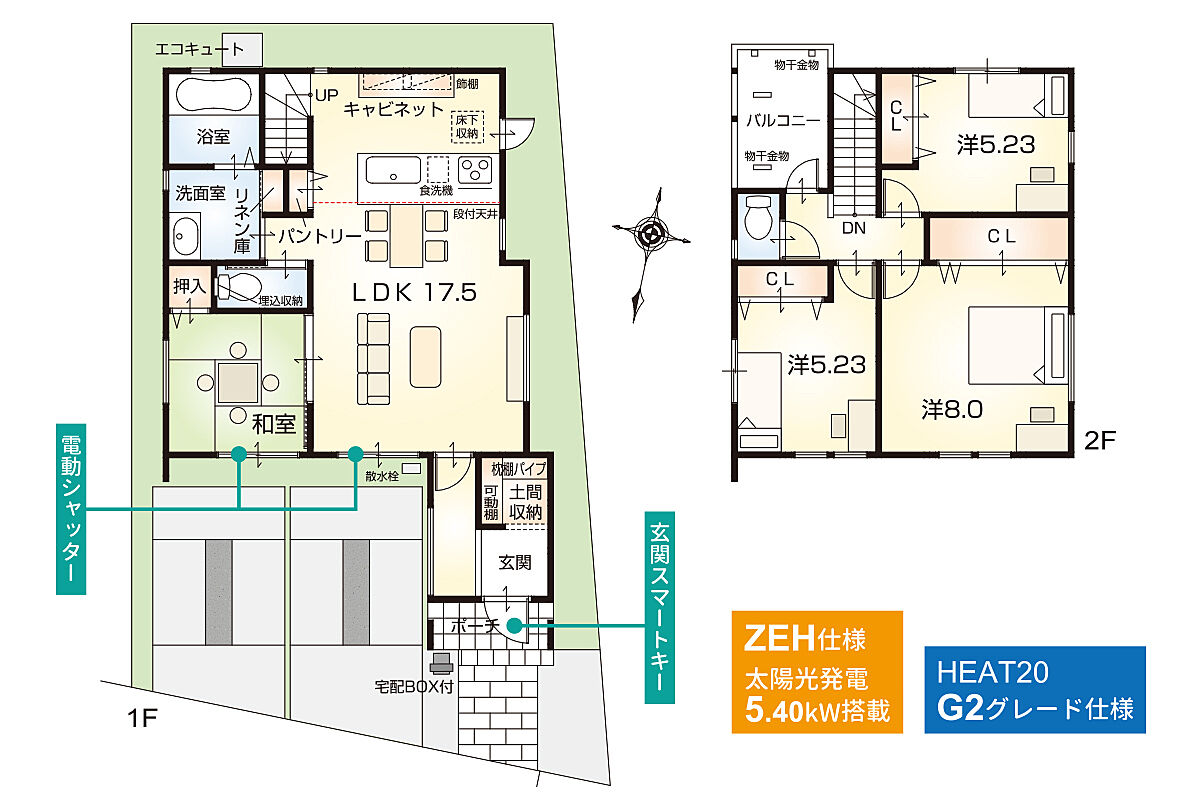 ■太陽光発電5.40kW搭載の【ZEH仕様】が全戸標準!さらに【HEAT20・G2グレード仕様】付!先進仕様充実の、快適で高性能な住まいを実現します。