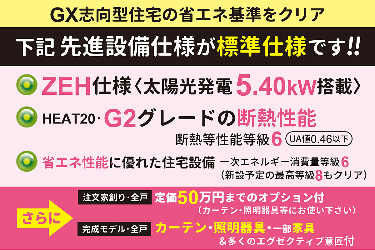 ■太陽光発電5.40kW搭載の【ZEH仕様】が全戸標準!さらに【HEAT20・G2グレード仕様】付!先進仕様充実の、快適で高性能な住まいを実現します。