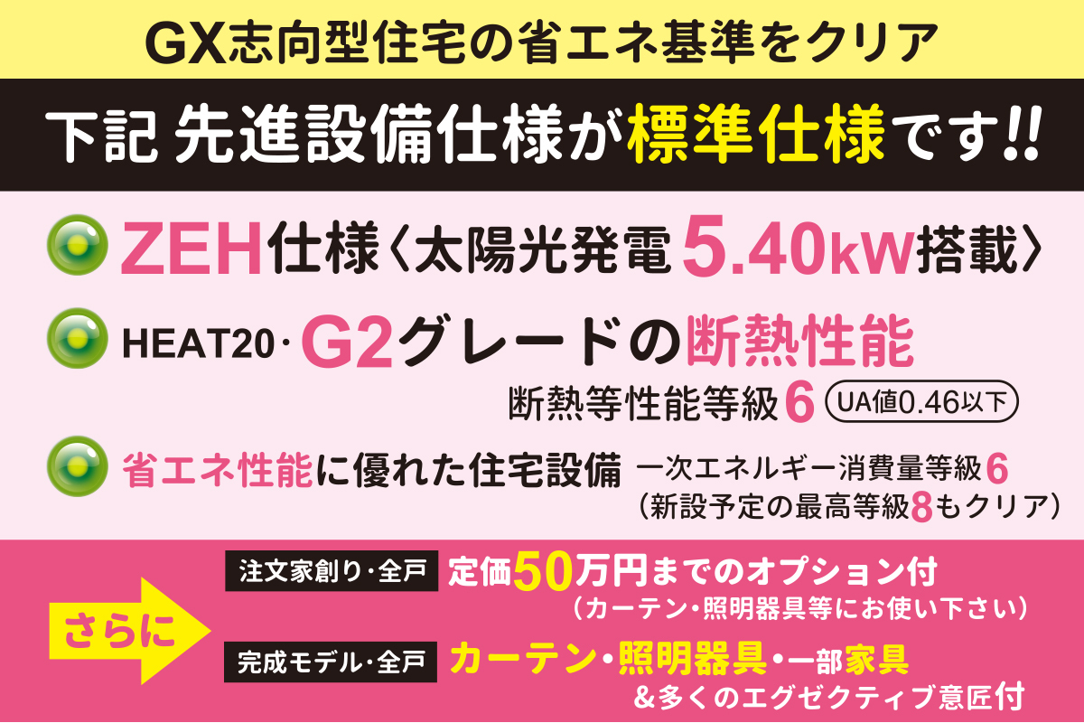 ■太陽光発電5.40kW搭載の【ZEH仕様】が全戸標準!さらに【HEAT20・G2グレード仕様】付!先進仕様充実の、快適で高性能な住まいを実現します。