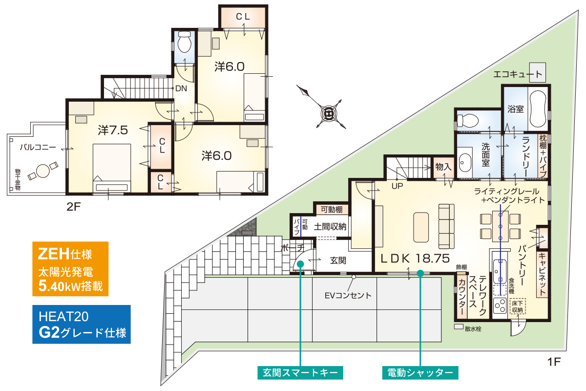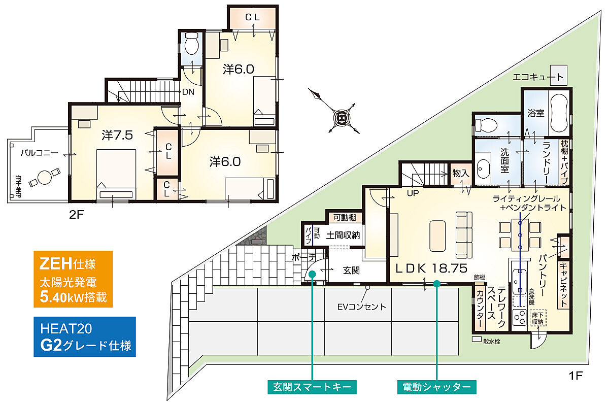 ■太陽光発電5.40kW搭載の【ZEH仕様】が全戸標準!さらに【HEAT20・G2グレード仕様】付!先進仕様充実の、快適で高性能な住まいを実現します。