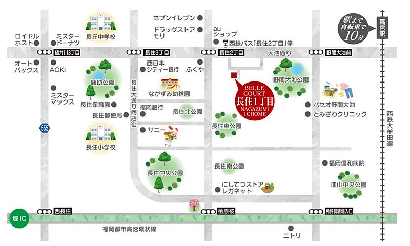 ヴェルコート長住1丁目から 》》》【教育機関】・「長住」小学校…徒歩14分・「長丘」中学校…徒歩17分・ながずみ幼稚園…徒歩8分 【交通機関】・西鉄バス「長住2丁目」停…徒歩3分・西鉄大牟田線「高宮」駅…車で4分 【ショッピング】・パセオ野間大池…車で2分・サニー長住店…車で2分 【公園】・野間大池公園…徒歩5分・長住東公園…徒歩9分